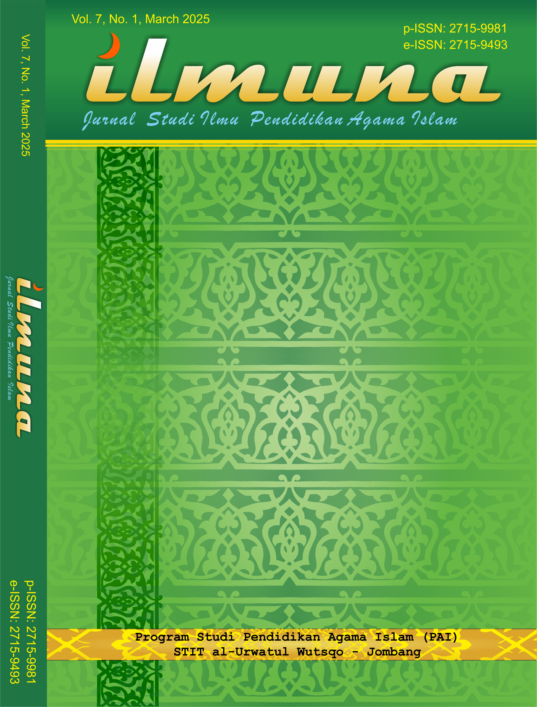 Vol. 7 No. 2 (2025)lmuna is Islamic Education journal published by Islamic Religious Education Study Program of STIT al Urwatul Wutsqo Bulurejo Jombang. it is ofcused on Islamic Religious Education from various multidisciplinary sciences. Published in 2 (two) times a year (March and September), and It is accredited “Sinta 4”, based on the Decree of higher education general, Research and Technology, Ministry of Education, Culture, Research and Technology of Republic Indonesia No 1469/E5/DT.05.00/2024